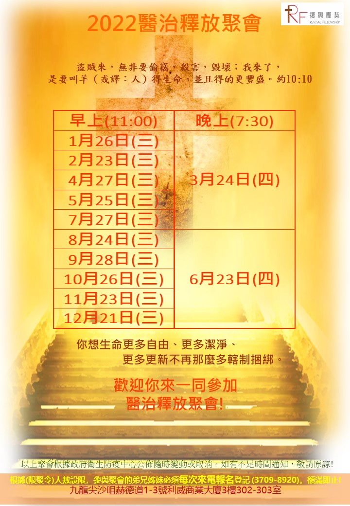復興團契的異象和使命就是神的國度建立在香港。 藉著禱告 ,祈求神的恩典使個人、家庭、教會悔改、更新和復興, 成為主耶穌聖潔的新婦,不單忠心承擔主之大使命,更以神的榮耀充滿香港而事奉。團契每月都有定期聚會,內容以敬拜、認識真道和尋求復興為主。